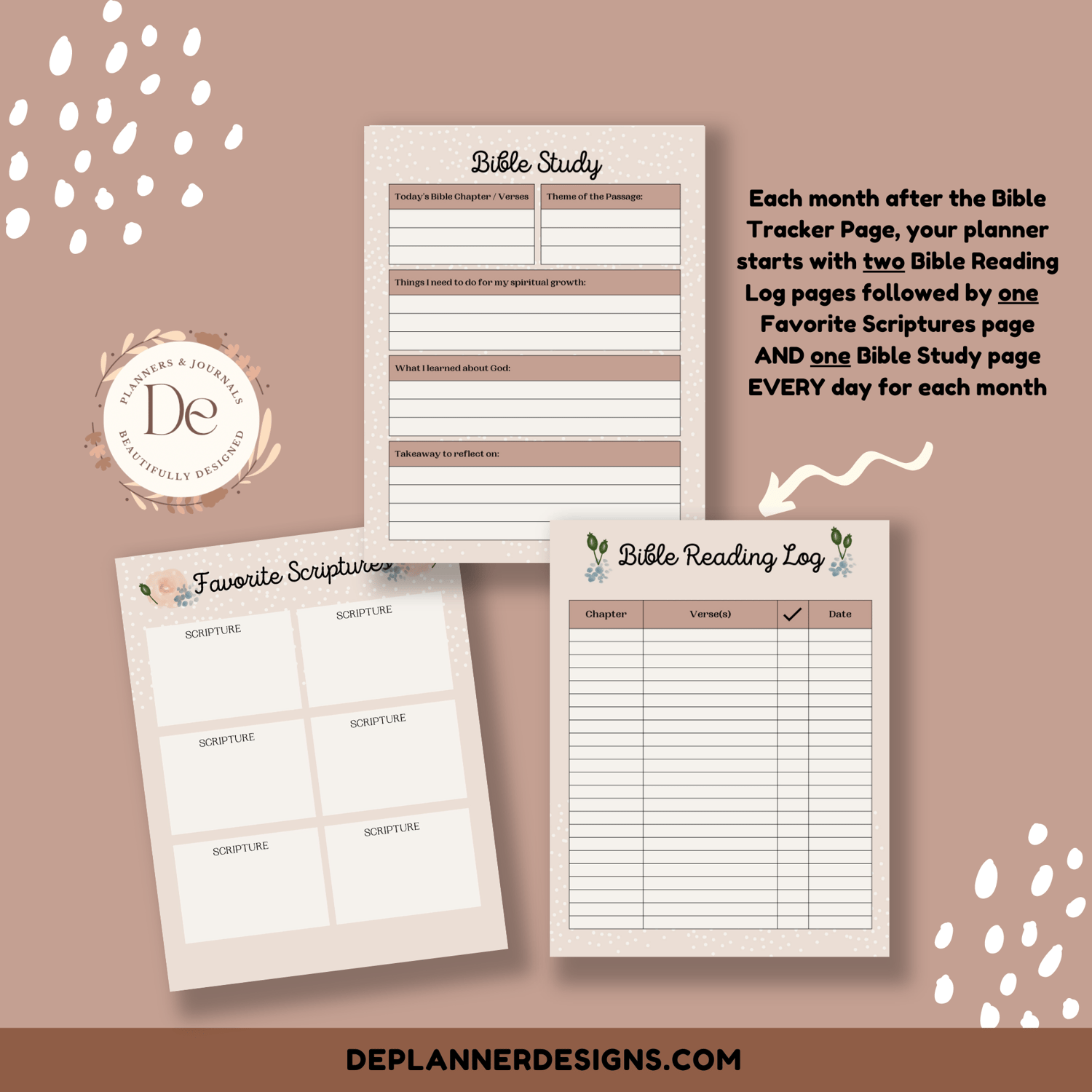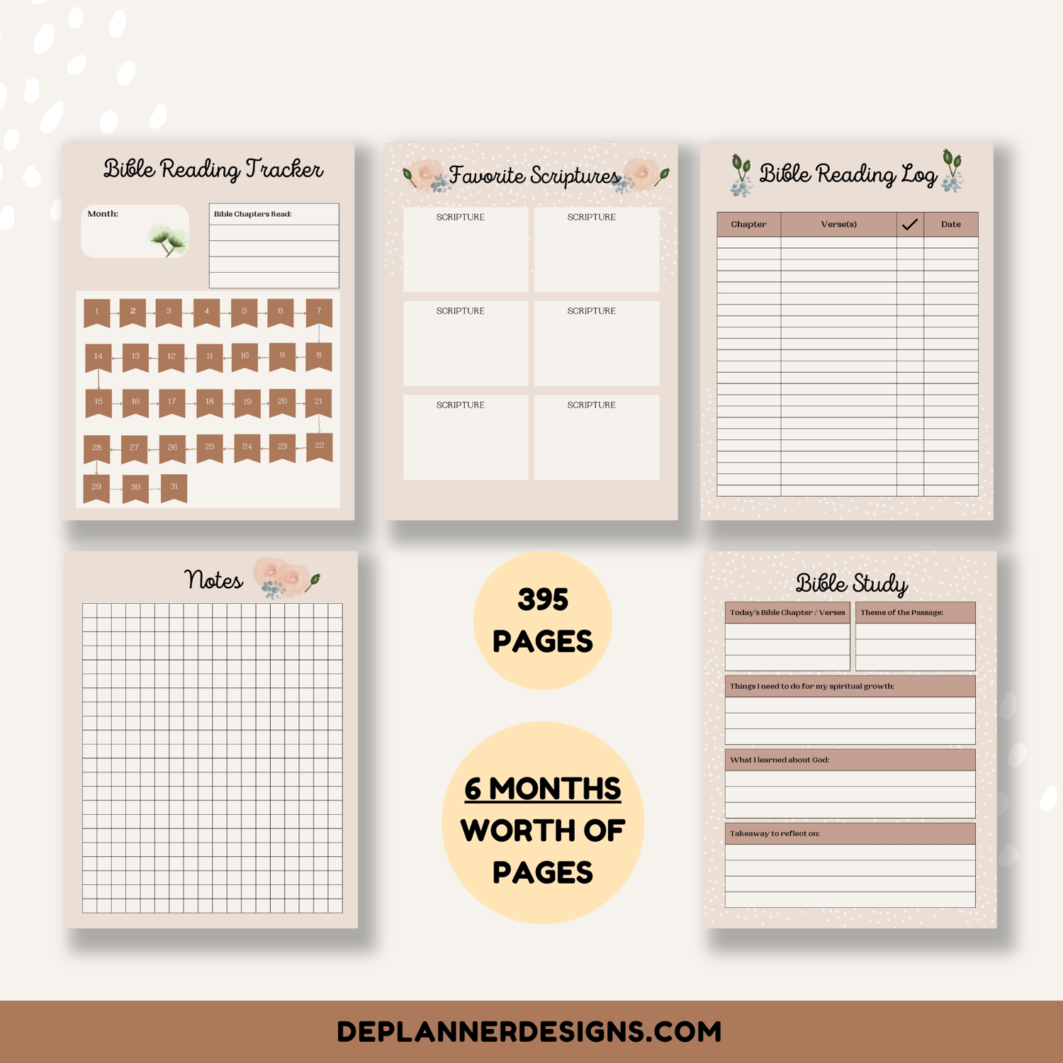 A collection of 394 total pages which includes a Bible Reading Tracker, Favorite Scriptures page, Bible Reading Log page, Bible Study page, and a Notes page to help you grow your spiritual journey.