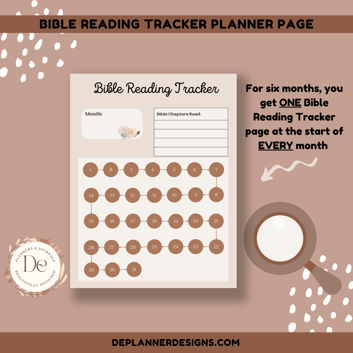 For six months, you get ONE Bible reading Tracker page at the beginning of EACH month. Next, you get TWO Bible Reading Log pages (total of 12 pages) at the start of EACH month for six months. Next, you get ONE Bible Study Page EVERY DAY (a total of 184 pages) for six months. Furthermore, you get ONE Favorite Scriptures page, EVERY day (a total of 184 pages). Lastly, you get ONE Notes page for EVERY month.