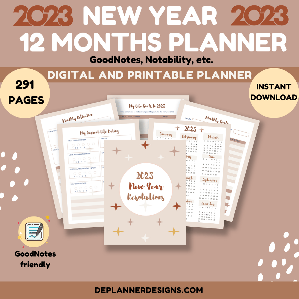 This cute, undated planner has a modern gradient soft boho background with subtle star designs. It is a collection of 291 total planner pages to help you plan your 2023 New Year Resolutions and reflect on your 2022 life. It’s not too late to start! If you have started, kudos! get this cute planner to keep at it!