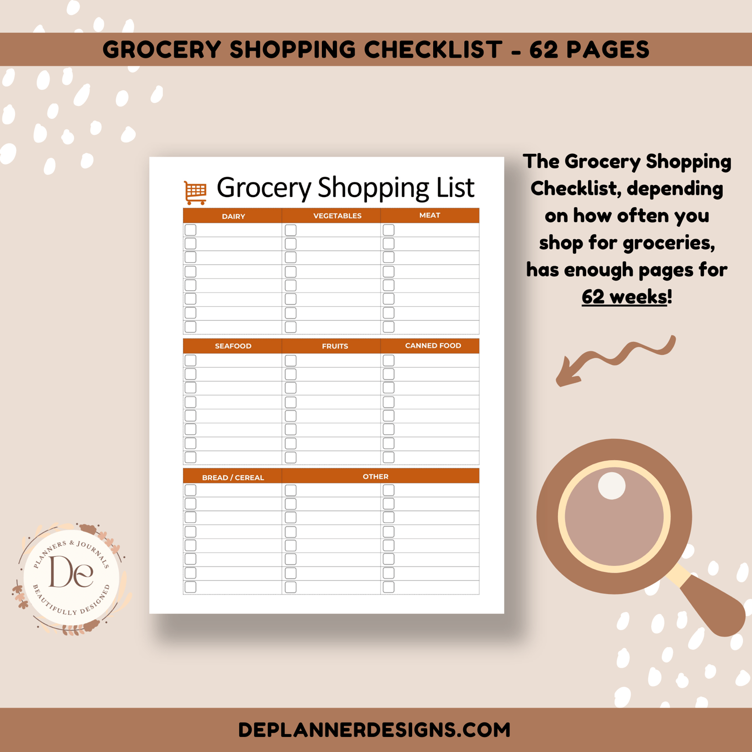 **The Grocery Shopping Checklist, depending on how often you shop for groceries, has enough pages for 62 weeks!